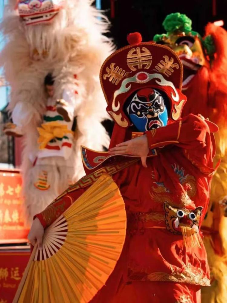 图为在伦敦举行的2025年“四海同春”新春文化庆典活动上,朱浩然等队员们表演“引狮员高台钳腰狮身旋转1080度”动作。