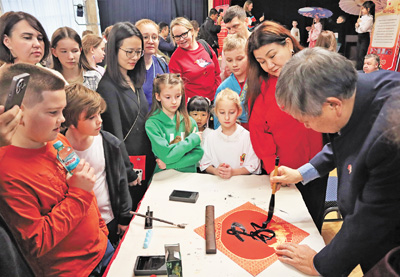 2月,俄罗斯中小学师生在莫斯科观看中国书法展示。