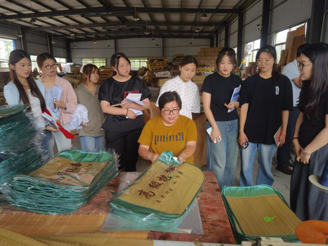 团队首站抵达草编产业车间。轰鸣的机器声中,传统手工编织与现代生产线交织,非遗传承人指导下的精品手作与标准化生产的草编日用品并行。队员们穿梭其间,观察蔺草选材、预处理、编织、包装的完整流程,但陈旧的设备与有限的设计创新,也让队员直观感受到产业升级的迫切需求。
