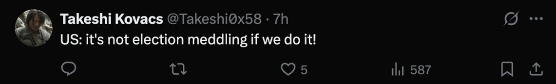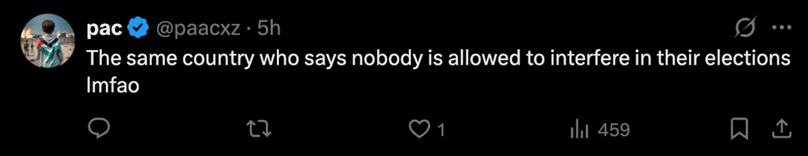 特朗普的言论在社交平台X上引发争议。有网友表示,“也是同一个国家曾说不允许任何人干涉他们的选举,真是太好笑了。”↓