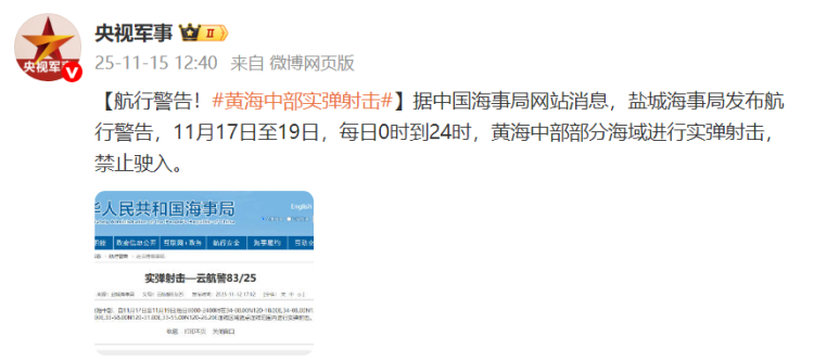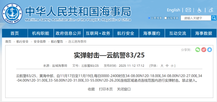 云航警83/25,黄海中部,自11月17日至11月19日,每日0000-2400时在34-08.00N120-18.00E,34-08.00N120-27.00E,34-04.00N120-31.00E,33-58.00N120-31.00E,33-55.00N120-26.20E连线区域诸点连线范围内进行实弹射击。禁止驶入。