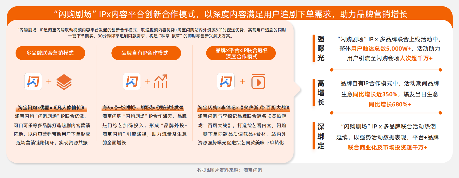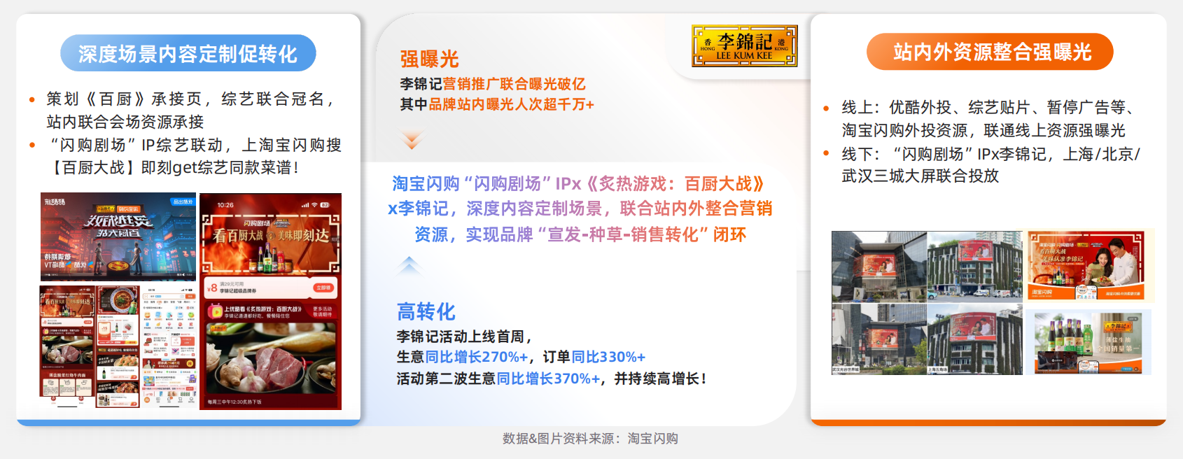 通过「品牌x平台x IP联合冠名」的深度合作模式,淘宝闪购“闪购剧场”IP更是携手李锦记联合冠名《炙热游戏:百厨大战》,通过定制内容深度植入和全域资源联动,不仅拉动了即时转化,实现了站内外强曝光,更完成了品牌与消费场景的深度绑定。