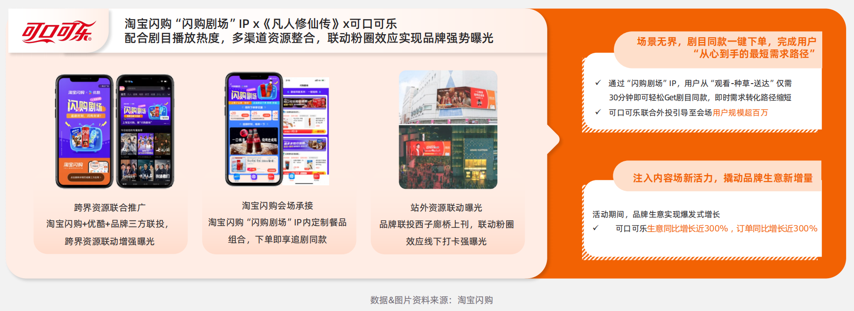 在与热剧的联动上,淘宝闪购“闪购剧场”IP就借力《凡人修仙传》,与可口可乐、亿滋等品牌共同打造了“剧目同款一键下单”的超短转化链路,通过线上线下共振与流量精准引导,不仅实现了会场百万级用户引流,更直接推动了品牌生意同比近300%的爆发式增长。
