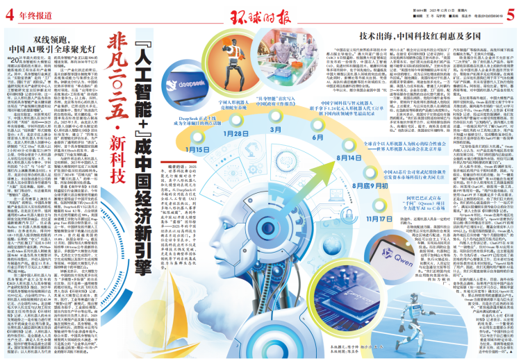 【环球时报报道 记者 陈子帅 杨沙沙 王冬】编者的话:2025年,世界科技舞台的聚光灯频频对准中国,其中人形机器人和大模型的表现尤为亮眼。从DeepSeek以卓越的实用能力引发全球人工智能(AI)开发者社区热议,到多场人形机器人赛事“极限破圈”,再到年底中国AI开源大模型集体“霸榜”国际榜单——2025年的中国经济正以AI高科技为新名片迈出国门。多位受访专家表示,中国高科技应用不仅是单项技术偶发突破,更是来自新型举国体制统筹下的系统集成能力与集群生态优势。
