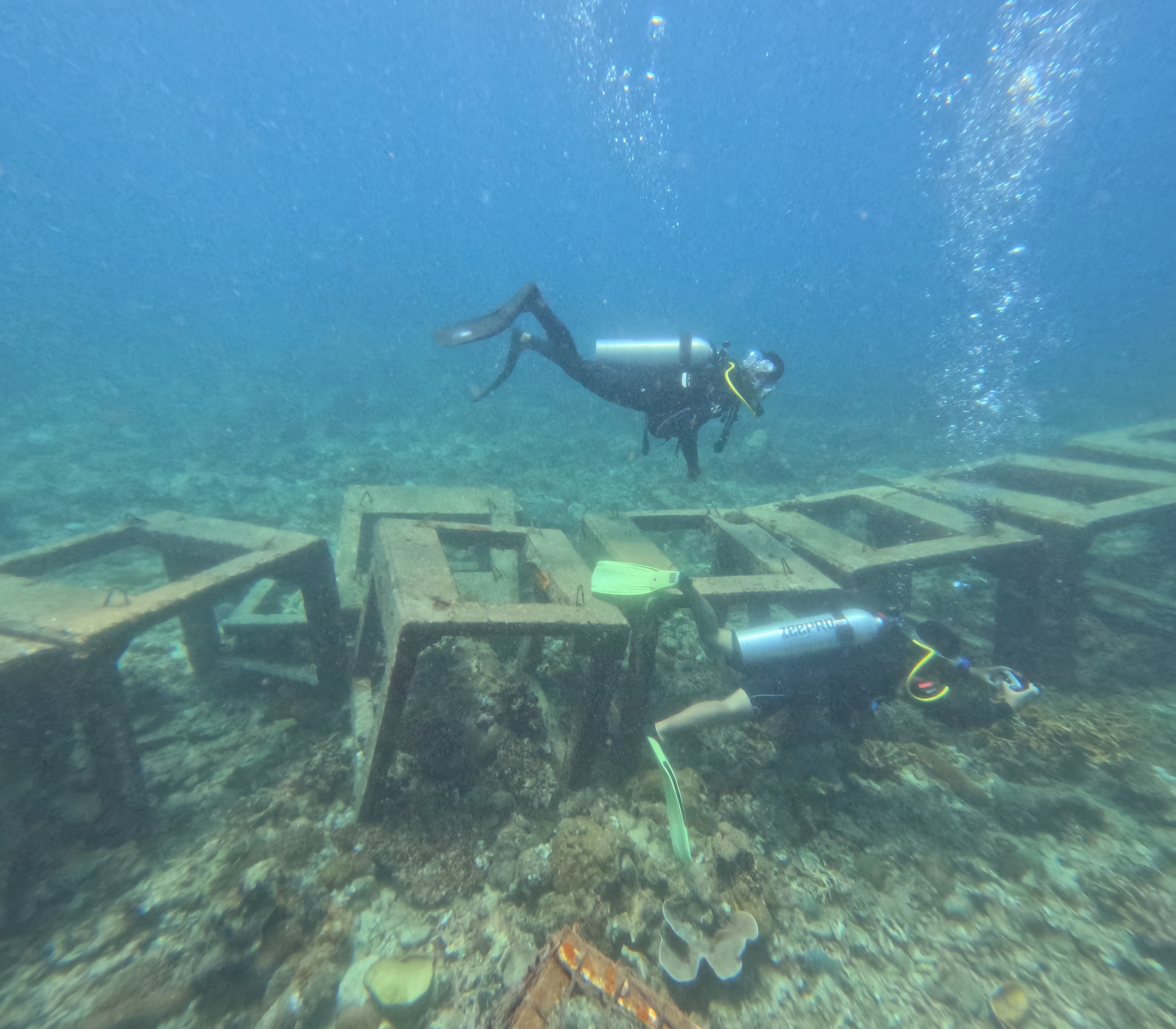 作为海洋生态系统的重要组成,珊瑚礁为众多海洋生物提供栖息、繁殖与庇护场所,科学家们将其称为“海洋中的热带雨林”。项目开展至今,上海海洋大学携手广东海洋大学、印尼哈山努丁大学等合作伙伴,深入开展珊瑚修复区划技术、珊瑚与关键增殖种类优选技术、珊瑚移植技术以及增殖养护技术等4项关键技术研究,完善养护型与增殖型海洋牧场的建设体系,在印尼邦内坦蓬岛海域为海洋生物设计和建造了一个家园。
