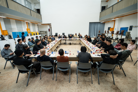 4月11日湖北美术学院的创作室里出现了难得一见的场面:台下围坐的是来自清华大学美术学院、中央美术学院、中国美术学院,甚至远渡重洋而来的白俄罗斯国立艺术学院等12所国内外顶尖美院的雕塑系名家,不少都是业内响当当的系主任级人物。而他们共同写生的模特,正是本次活动的学术主持、著名雕塑理论家孙振华先生。
