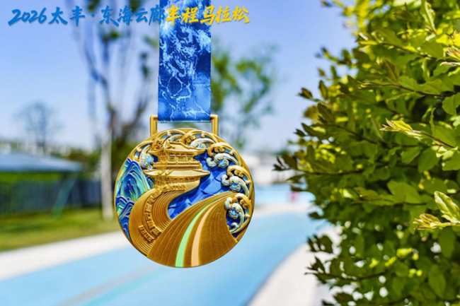 组委会为完赛选手精心打造的奖牌采用立体浮雕工艺,正面清晰镌刻赛事全称,以东海云廊形象和状元阁为核心,环绕海浪与五山纹样,尽显定海“山海相拥”的地理特色,寓意跑者“云中漫步、逐浪奔跑”的畅快;背面刻印东海云廊logo和“定海山”三个字,充分彰显定海地域特色,同时标注21.0975KM里程数及“FINISHER”字样,是对每一位完赛跑者最好的致敬。